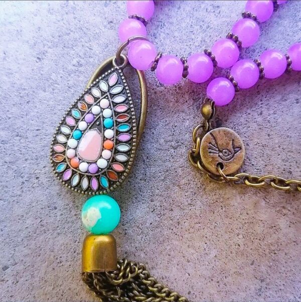 Collar de perlas de vidrio color lila claro, medalla de metal envejecido esmaltado y borla de cadena con top de JASPE AQUATERRA.